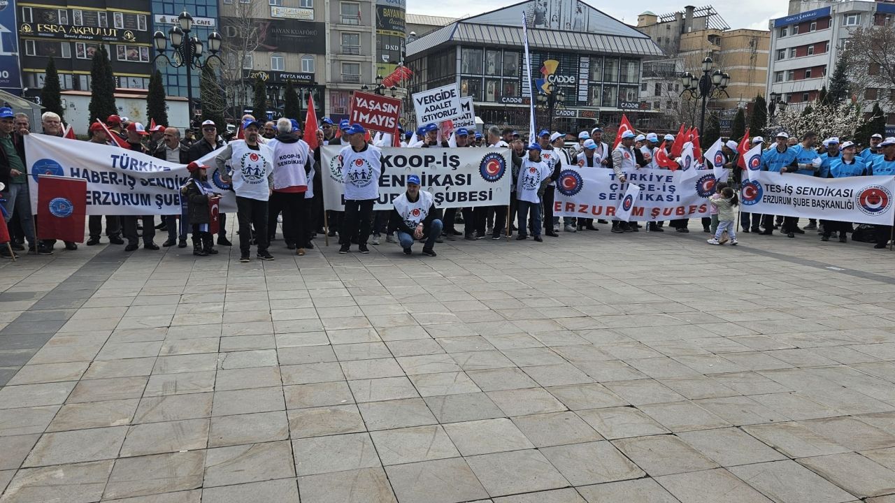 Erzurum'da TÜRK-İŞ tarafından Yakutiye Medresesi önünde düzenlenen programda bir araya gelen bazı sendikaların üyeleri, açtıkları pankartlarla işçilerin bayramını kutladı.