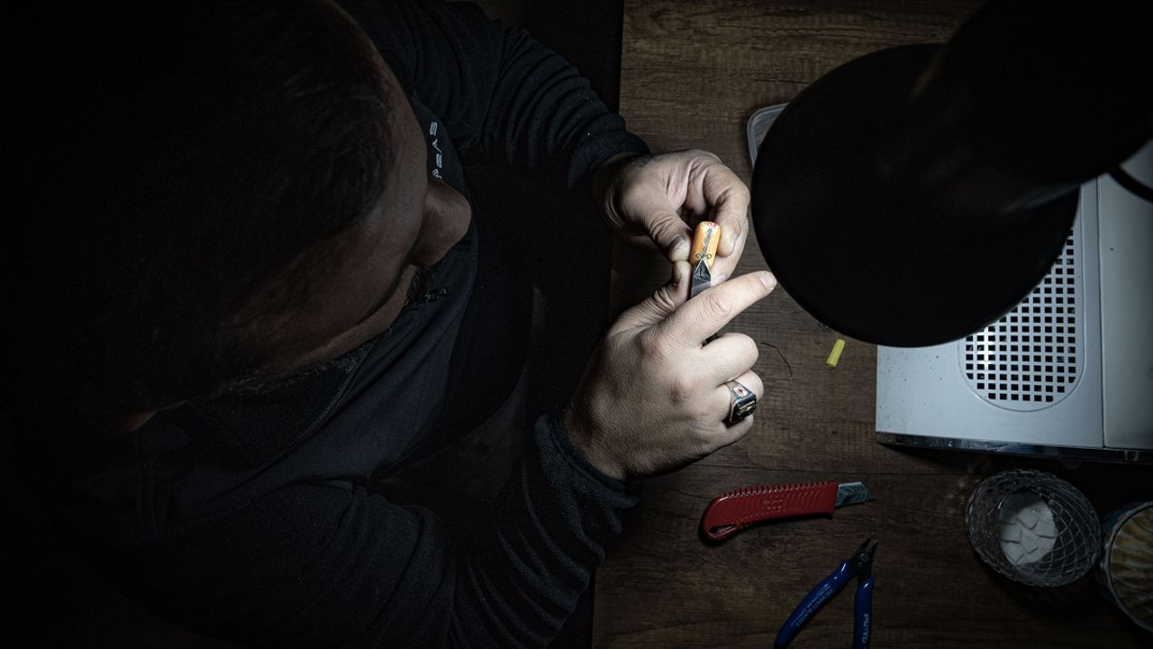 Çelebi, atölyeye dönüştürdüğü evinde, sipariş üzerine Rusya'nın Kaliningrad şehrinden çıkan kaya damla kehribardan tasarladığı tespihin üzerine 24 ayar 55 gram altından işleme yaptı.