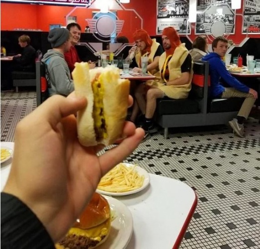 Arkadaki adamlar bu sosisli şakasından pek memnun değiller sanki