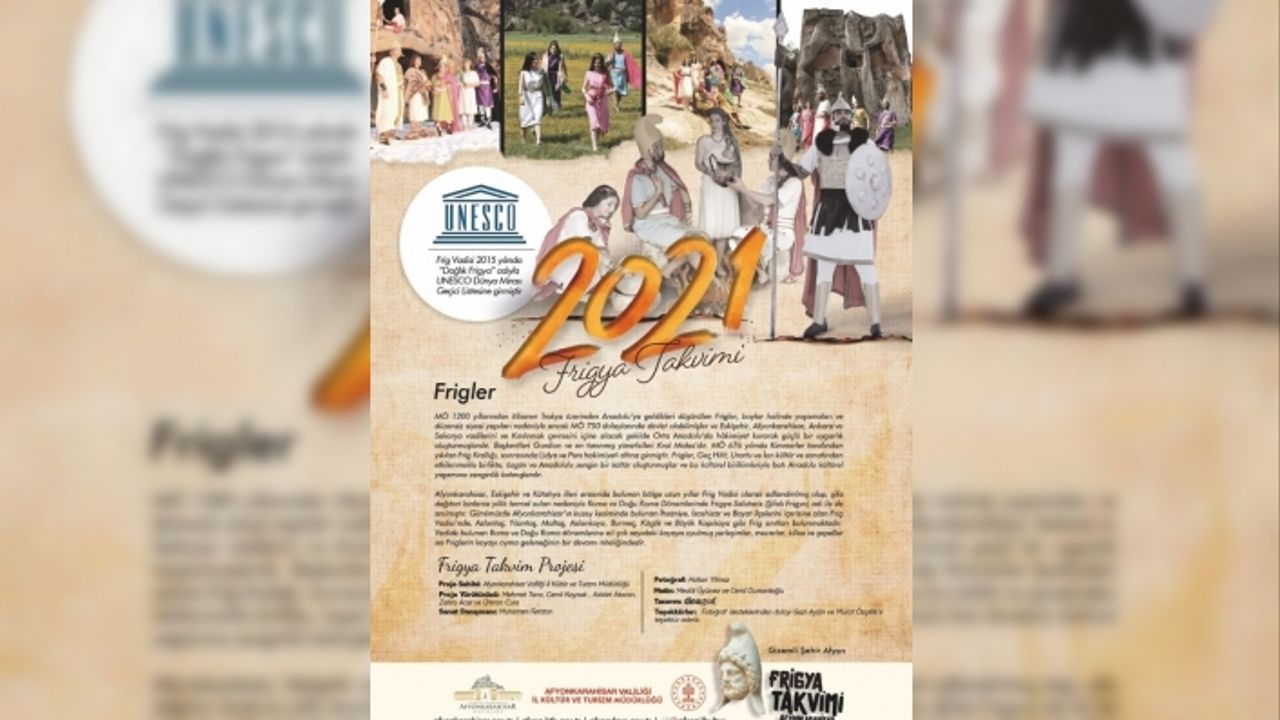 Afyonkarahisar Valiliği tarafından çok sayıda projenin yürütüldüğü Frig vadisi için ‘2021 Frigya Takvimi’ hazırlandı. Frigya Takviminde, Friglerin giyim kuşamlarına uygun elbiseleri giyen modellerin fotoğrafları da yer alıyor.