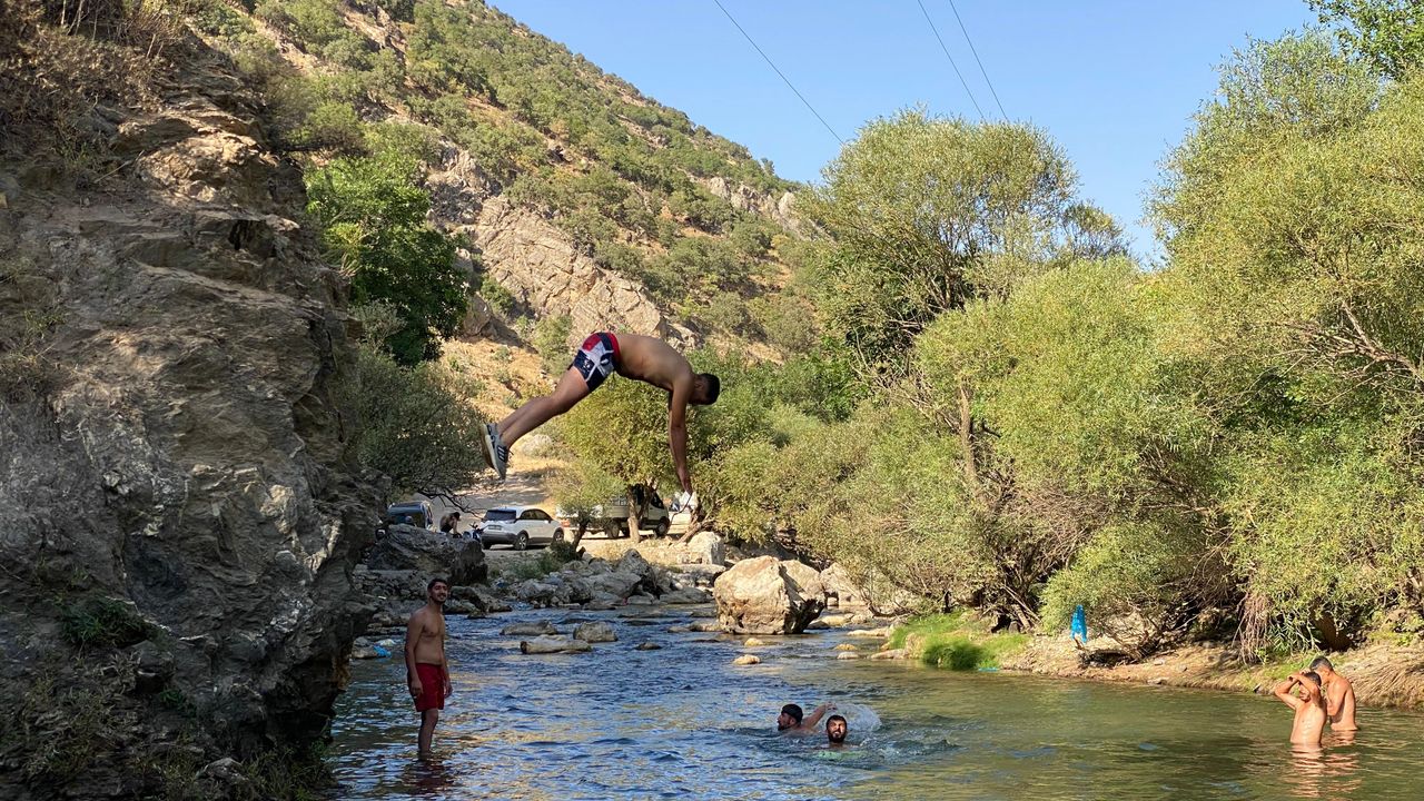 BİTLİS (AA) - Bitlis'in Hizan ilçesinde sıcaktan bunalan gençler ve çocuklar derede yüzerek serinliyor.