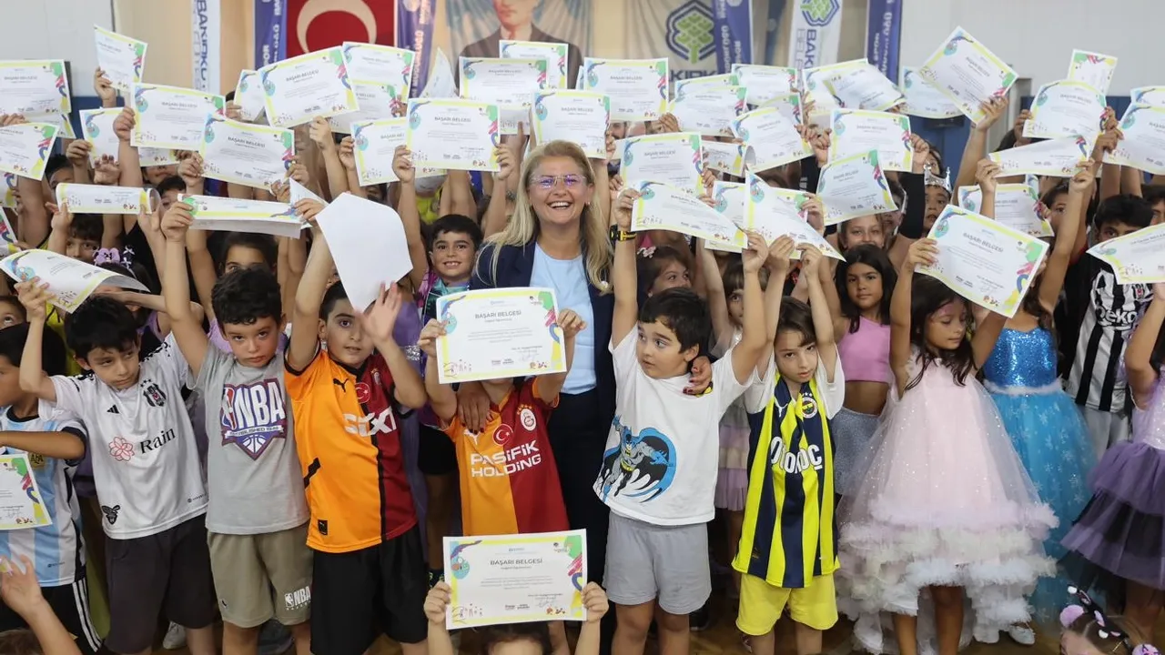 İstanbul Bakırköy Belediyesi’nin 6-15 yaş arası 744 öğrenciyi ücretsiz bir şekilde 8 farklı branşla buluşturduğu “Yaz Spor Okulu” keyifli bir törenle sezonu kapattı.İSTANBUL(İGFA) - Atatürk Spor ve Yaşam Köyü’nde Bakırköy Belediye Başkanı Doç. Dr. Ayşegül Ovalıoğlu’nun katılımıyla gerçekleştirilen kapanış töreni, kostüm partisi, dayanışma duygusunu güçlendirmek amacıyla her öğrencinin istediği herhangi bir eşyayı bıraktığı “Paylaşım Sandığı” ve su savaşı etkinlikleriyle taçlandı.
