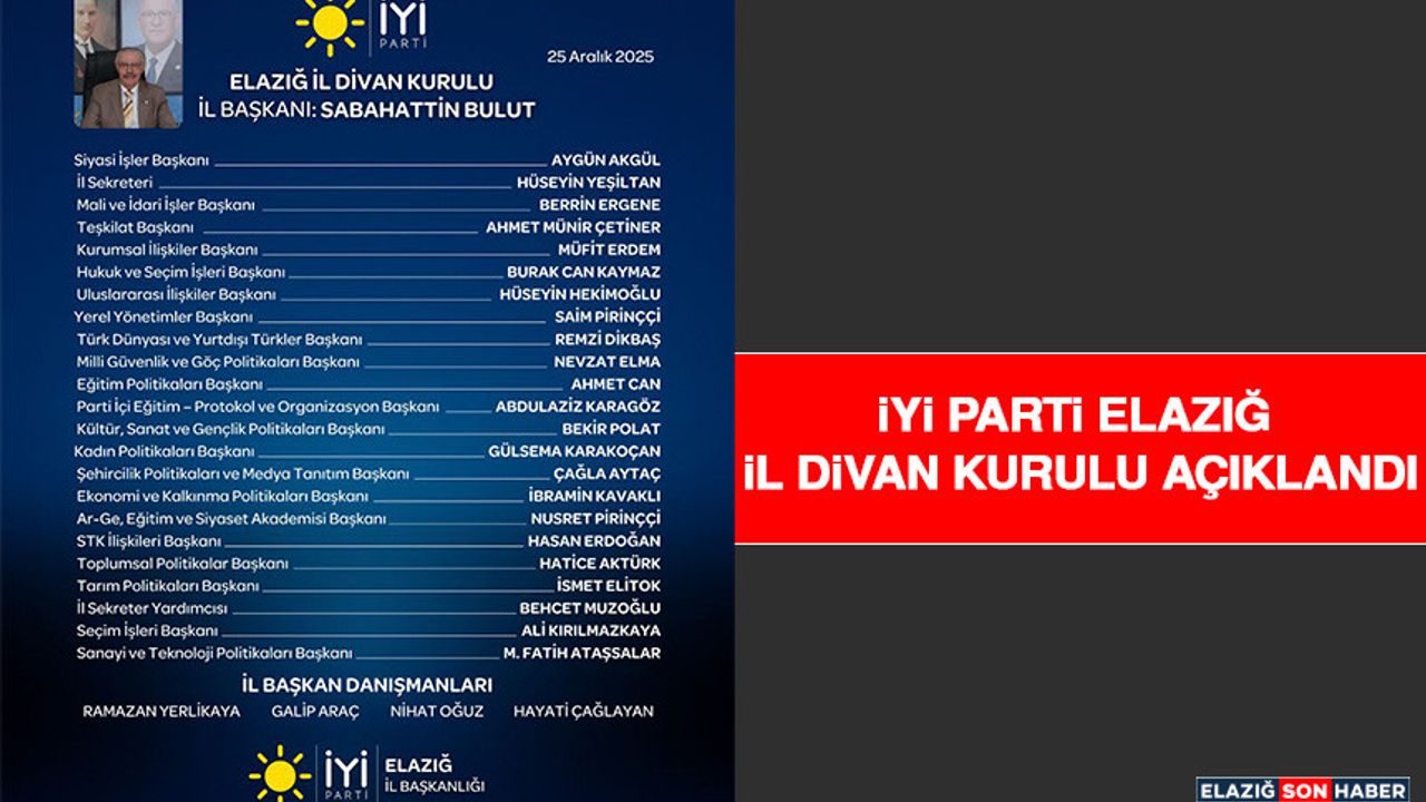 Yeni dönemde İl Divan Kurulu’nda görev alan isimler şu şekilde açıklandı: Siyasi İşler Başkanı Aygün Akgül, İl Sekreteri Hüseyin Yeşiltan, Mali ve İdari İşler Başkanı Berrin Ergene, Teşkilat Başkanı Ahmet Münir Çetiner, Kurumsal İlişkiler Başkanı Müfit Erdem, Hukuk ve Seçim İşleri Başkanı Burak Can Kaymaz, Uluslararası İlişkiler Başkanı Hüseyin Hekimoğlu, Yerel Yönetimler Başkanı Saim Pirinççi, Türk Dünyası ve Yurtdışı Türkler Başkanı Remzi Dikbaş, Milli Güvenlik ve Göç Politikaları Başkanı Nevzat Elma, Eğitim Politikaları Başkanı Ahmet Can, Parti İçi Eğitim–Protokol ve Organizasyon Başkanı Abdulaziz Karagöz, Kültür, Sanat ve Gençlik Politikaları Başkanı Bekir Polat, Kadın Politikaları Başkanı Gülsema Karakoçan, Şehircilik Politikaları ve Medya Tanıtım Başkanı Çağla Aytaç, Ekonomi ve Kalkınma Politikaları Başkanı İbrahim Kavaklı, Ar-Ge, Eğitim ve Siyaset Akademisi Başkanı Nusret Pirinççi, STK İlişkileri Başkanı Hasan Erdoğan, Toplumsal Politikalar Başkanı Hatice Aktürk, Tarım Politikaları Başkanı İsmet Elitok, İl Sekreter Yardımcısı Behçet Muzoğlu, Seçim İşleri Başkanı Ali Kırılmazkaya, Sanayi ve Teknoloji Politikaları Başkanı M. Fatih Ataşalar oldu.