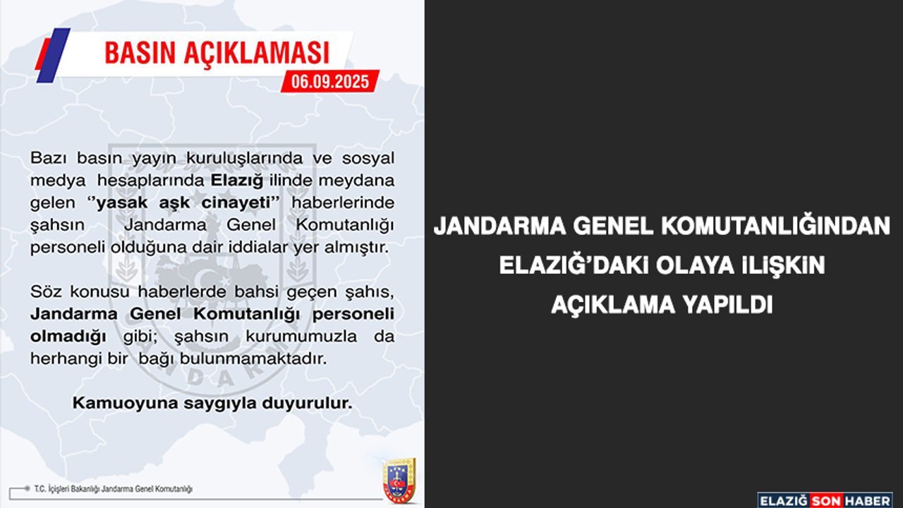 Elazığ’da meydana gelen ve bazı basın yayın organları ile sosyal medyada “yasak aşk cinayeti” başlığıyla yer alan haberlerde, olayın faili olduğu öne sürülen şahsın Jandarma Genel Komutanlığı personeli olduğu iddia edilmişti.