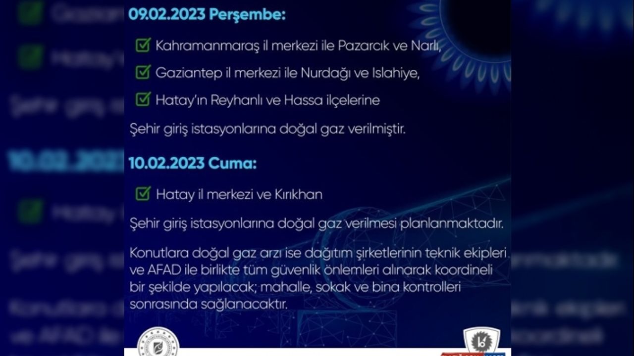 BOTAŞ sosyal medya hesabından deprem bölgelerine doğalgaz verilmesine ilişkin bilgileri paylaştı. Paylaşılan bilgilere göre, Kahramanmaraş il merkezi ile Pazarcık ve Narlı ilçesine, Gaziantep il merkezi ile Nurdağı ve Islahiye ilçesine, Hatay’ın Reyhanlı ve Hassa ilçelerine şehir giriş istasyonlarına doğalgaz verilmeye başlandı. Hatay il merkezi ve Kırıkhan ilçesine ise yarın şehir giriş istasyonlarına doğalgaz verilmesi planlanıyor. Paylaşılan bilgide konutlara doğalgaz arzının ise dağıtım şirketlerinin teknik ekipleri ve AFAD ile birlikte tüm güvenlik önlemleri alınarak koordineli bir şekilde yapılacağı ve mahalle, sokak ve bina kontrolleri sonrasında doğalgaz dağıtımı sağlanacağı belirtildi.