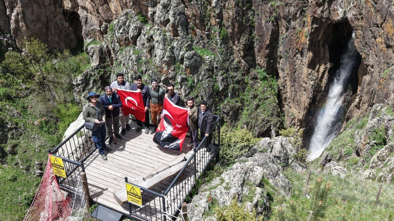 Doğaseverler güvenlik önlemleri aldıktan sonra özel ekipmanlarla yaklaşık 70 metrelik kayalıktan aşağı inerek Türk bayrağı açtı, daha sonra tırmanış yaptı.