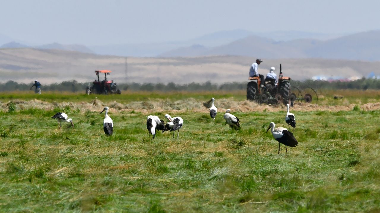 Otların biçimine başladıklarını anlatan Ekinci, 'Çayırlarda hasat topluyoruz. Leylekler, kurbağalarla, kurbağa yavrularıyla besleniyor. Hava sıcakları arttıkça temmuz, ağustos aylarında tarla ve çayırlarda görülen leylekler, kasım ayında buradan göç ediyorlar.' dedi.