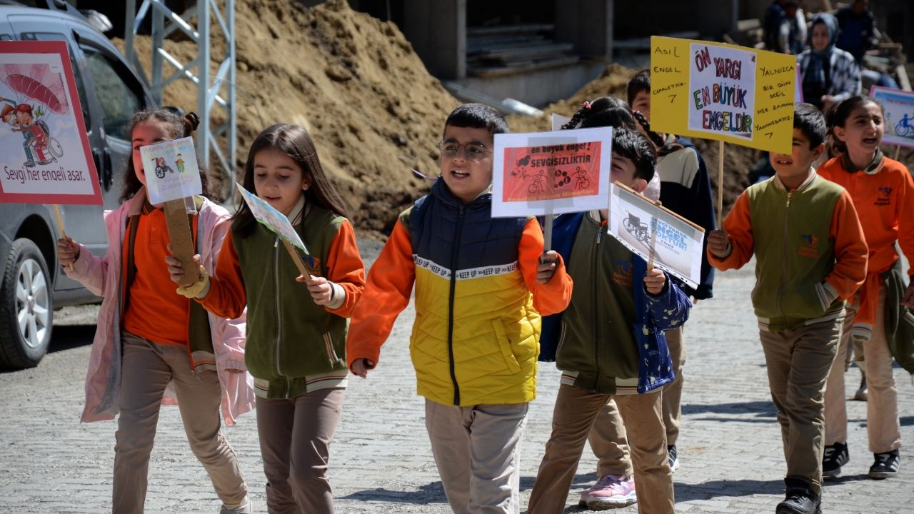 KARS (AA) - Kars'ın Sarıkamış ilçesinde ilkokul öğrencileri, "Engelliler Haftası" kapsamında işaret diliyle çeşitli mesajlar verip farkındalık yürüyüşü yaptı.