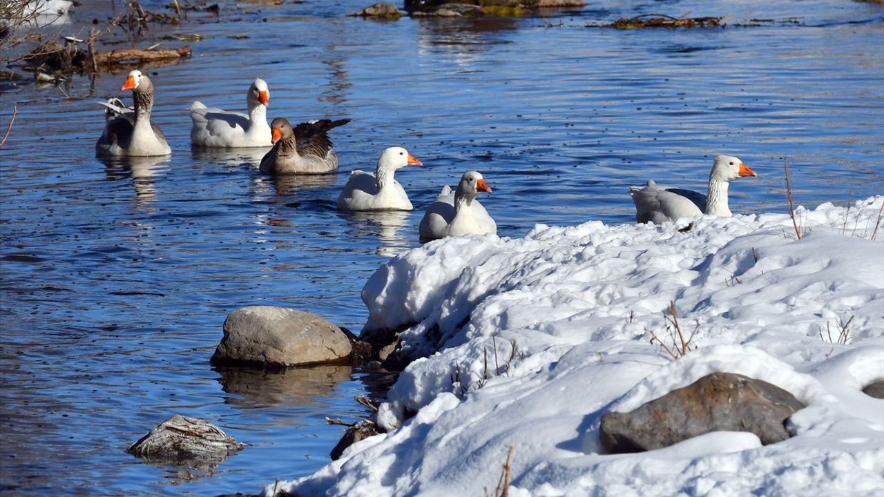 Yağbasan köyünde damızlık olarak beslenen kazlar, güneşin açmasıyla köy içinden geçen dereye girerek buz tutmayan kısımda yüzdü.