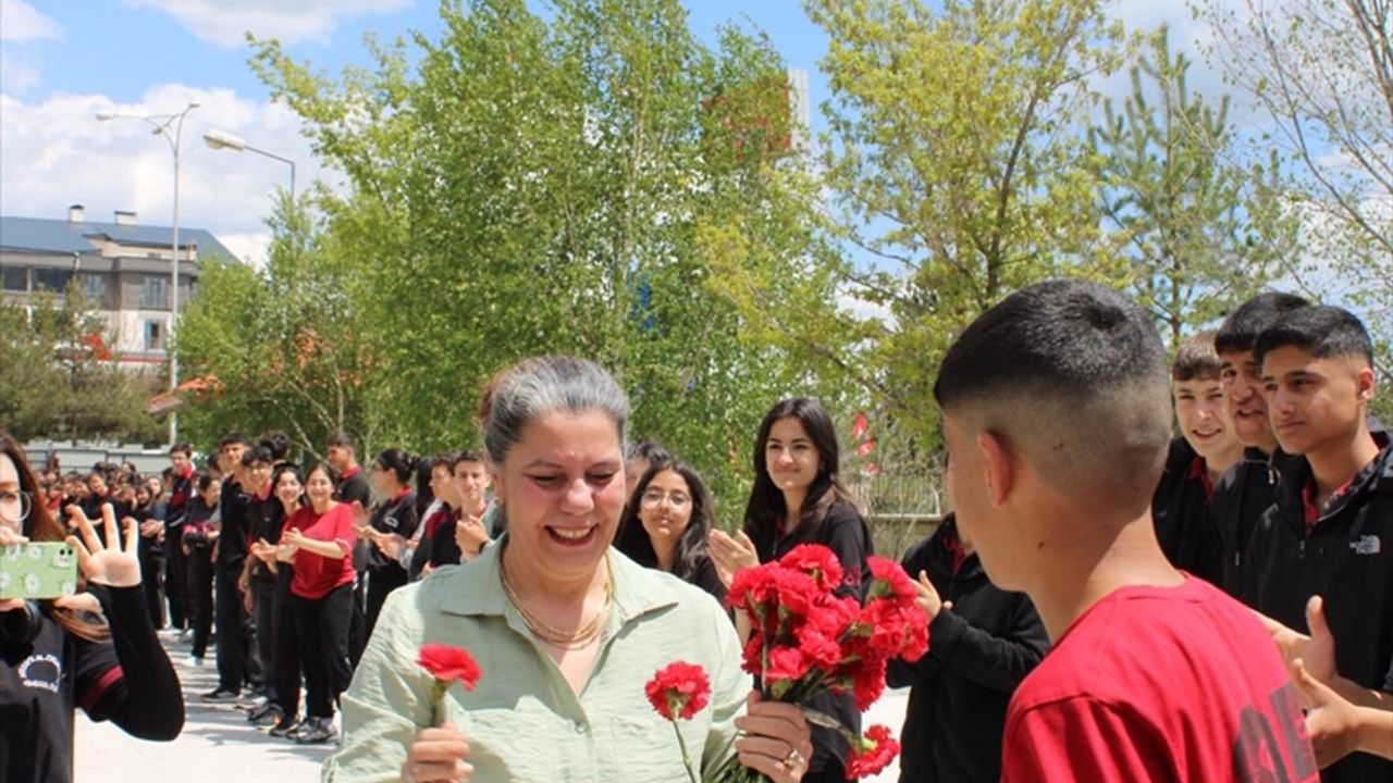 Hüsnü Özyeğin Anadolu Lisesi öğrencileri, öğretmenleri ve idarecileri, son dersini vermek için okula gelen Kösem'i çiçeklerle karşıladı.