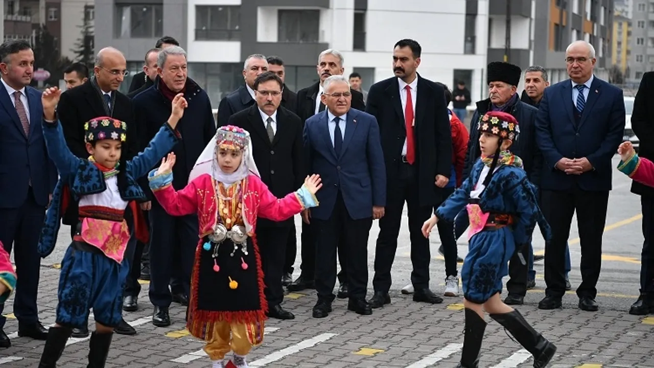 Öğrenciler, Başkan Büyükkılıç, Akar ve beraberlerindeki heyeti ellerinde Türk bayrakları ve çiçeklerle karşıladı.