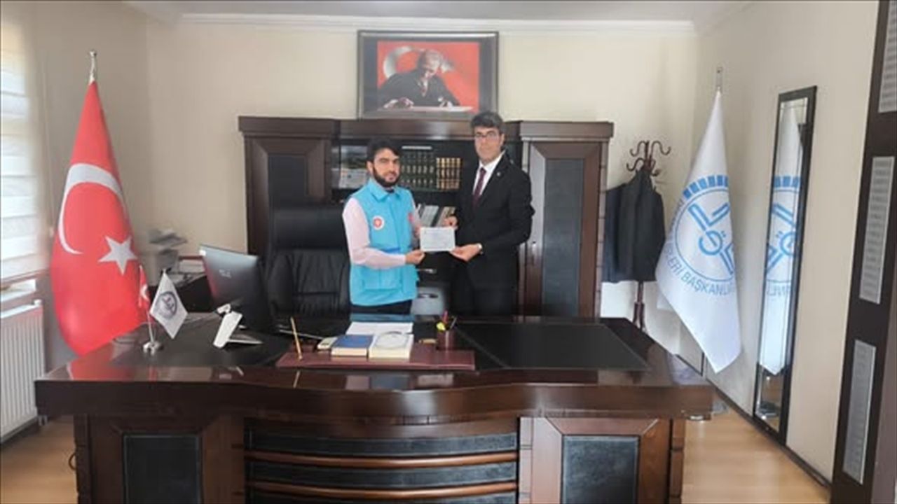 İlçe Milli Eğitim Müdürü Ferhat Emre tarafından Filistin'e destek için okullarda düzenlenen kermeslerde elde edilen gelir İlçe Müftüsü Murtaza Meşe'ye verildi.