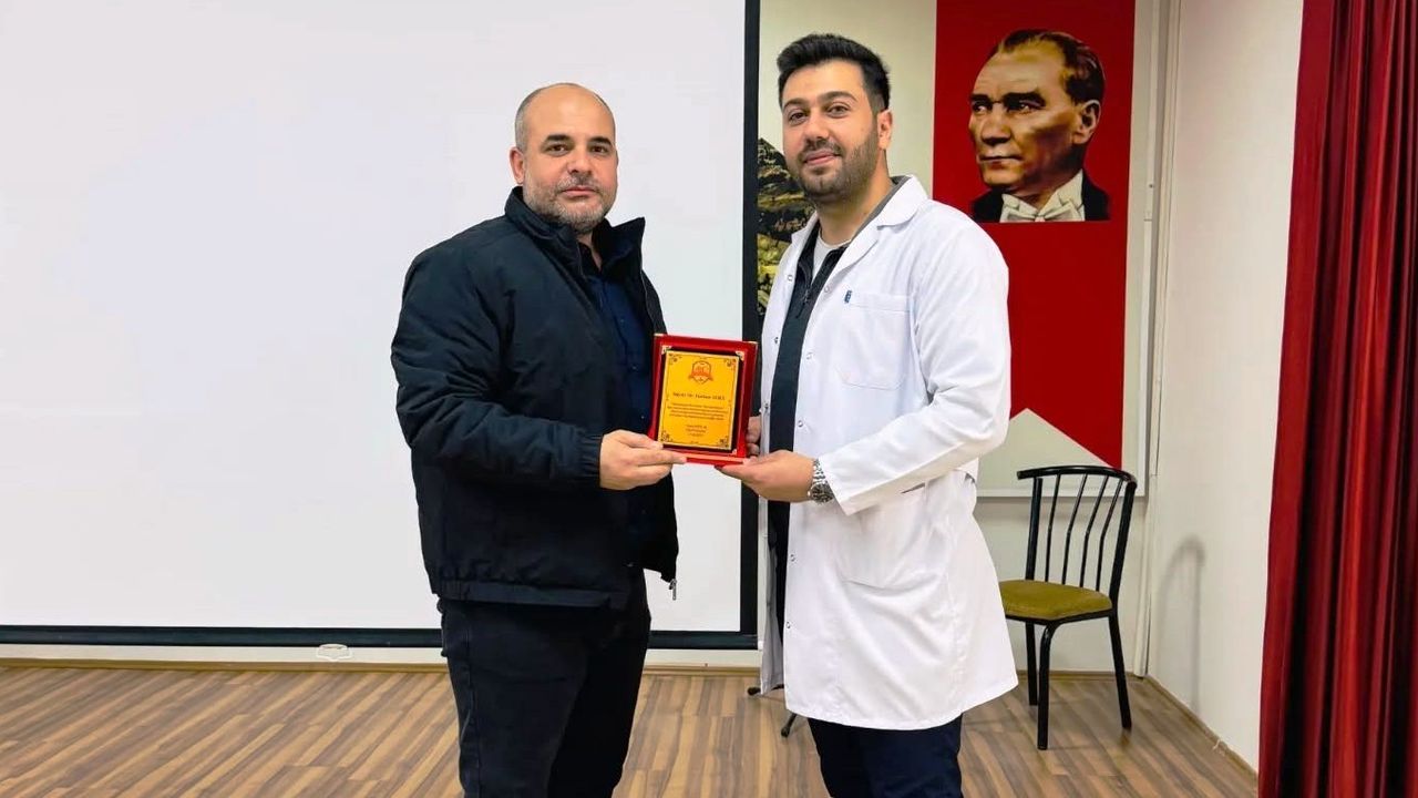 Musa Coşkun Ortaokulu Müdürü Yaşar Bakır, öğrencilere yapmış olduğu bilgilendirmeden dolayı teşekkür ettiği Cora'ya, plaket takdim etti.