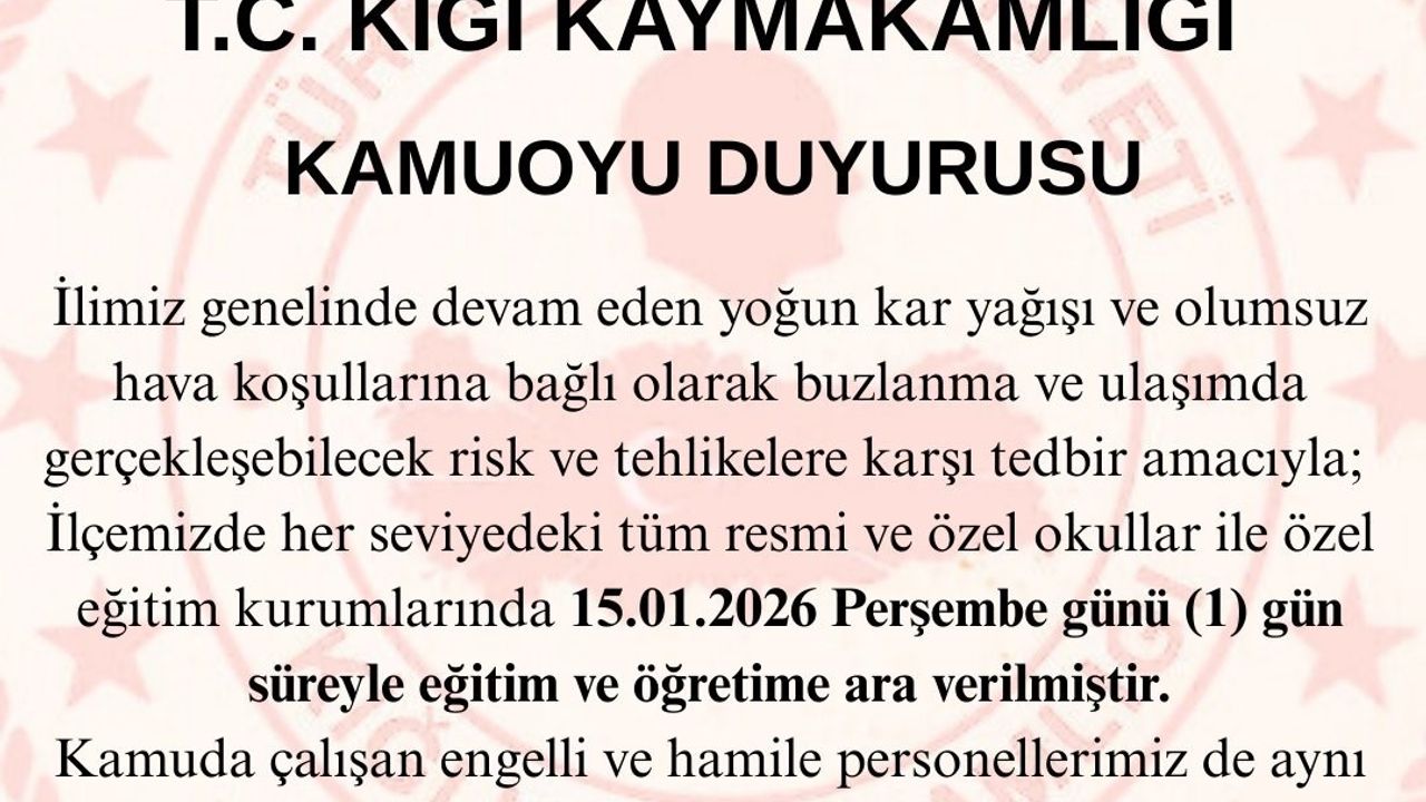Kiğı'da kar yağışının ardından aşırı buzlanma ve don olayları devam ediyor. Bu çerçevede Kiğı kaymakamlığı tarafından yapılan açıklamada, buzlanma ve ulaşımda yaşanacak olumsuzluklar nedeniyle, 15 Ocak 2026 Perşembe günü ilçe genelinde eğitim ve öğretime 1 gün ara verildiğini ve aynı gün kamuda çalışan hamile ve engelli personellerin idari izinli sayılacağını duyurdu.
