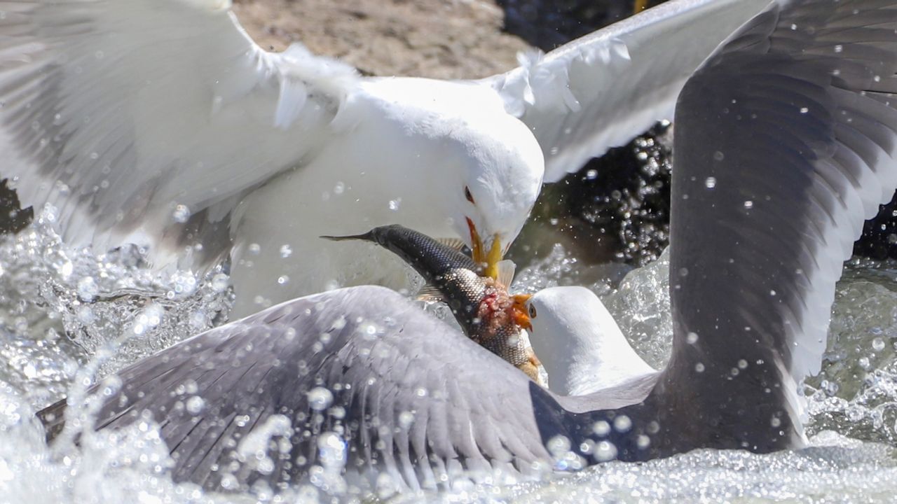 Balık göçünün yoğun yaşandığı Muradiye ilçesindeki akarsulara akın eden martılar, inci kefallerini avlayarak besleniyor.