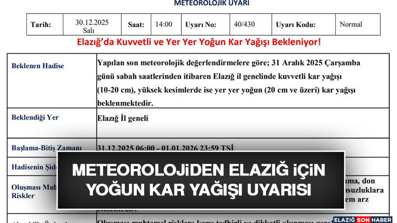 Meteoroloji 13. Bölge Müdürlüğü’nden yapılan açıklamada, "Yapılan son meteorolojik değerlendirmelere göre; 31 Aralık 2025 Çarşamba günü sabah saatlerinden itibaren Elazığ il genelinde kuvvetli kar yağışı (10-20 cm), yüksek kesimlerde ise yer yer yoğun (20 cm ve üzeri) kar yağışı beklenmektedir. Kar yağışıyla birlikte oluşabilecek; ulaşımda aksamalar, kuvvetli buzlanma, don olayı ile yüksek kesimlerde tipi ve eğimli yüksek bölgelerde çığ gibi olumsuzluklara karşı vatandaşlarımızın ve ilgili birimlerin dikkatli ve tedbirli olması önem arz etmektedir" denildi.
