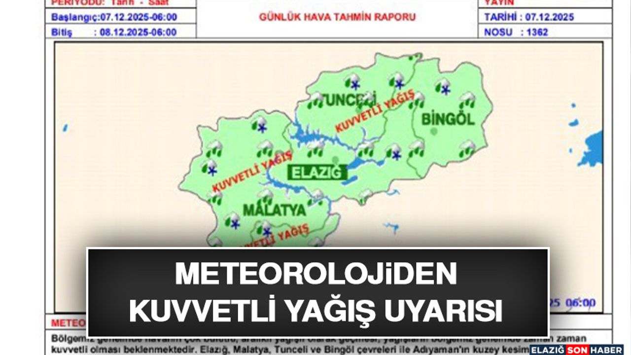 Meteoroloji 13. Bölge Müdürlüğü’nden yapılan açıklamada, "Bölgemiz genelinde beklenen kuvvetli yağışların, Elazığ, Malatya, Tunceli ve Bingöl çevreleri ile Adıyaman’ın kuzey kesimlerinde kuvvetli yağmur yüksek kesimlerinde ise (1500 metre rakım üzeri) kuvvetli karla karışık yağmur ve kar yağışı beklenmektedir. Bu nedenle oluşması beklenen ani sel, su baskını, ulaşımda aksamalar, kar yağışı olan yerlerde buzlanma ve don olayı, yağış anında kuvvetli rüzgar ve tipi gibi olumsuzluklara karşı dikkatli olunmalıdır" denildi.
