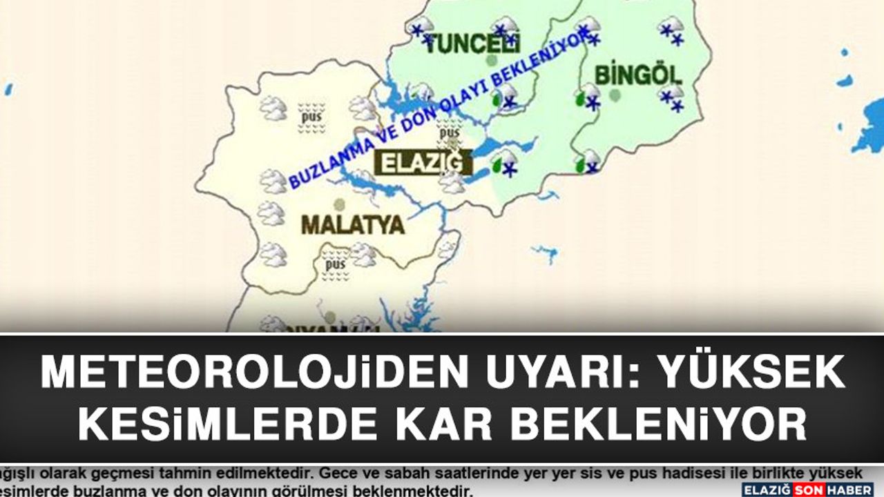 Meteoroloji 13. Bölge Müdürlüğü’nden yapılan uyarıda, "Bölgemiz genelinde havanın parçalı yer yer çok bulutlu, öğle saatlerinden itibaren Tunceli ve Bingöl çevreleri ile Elazığ’ın doğusun aralıklı yağmurlu ve karla karışık yağmurlu yüksek kesimlerin (1500 metre ve üzeri) ise yer yer kar yağışlı olarak geçmesi tahmin edilmektedir. Gece ve sabah saatlerinde yer yer sis ve pus hadisesi ile birlikte yüksek kesimlerde buzlanma ve don olayının görülmesi beklenmektedir" denildi.