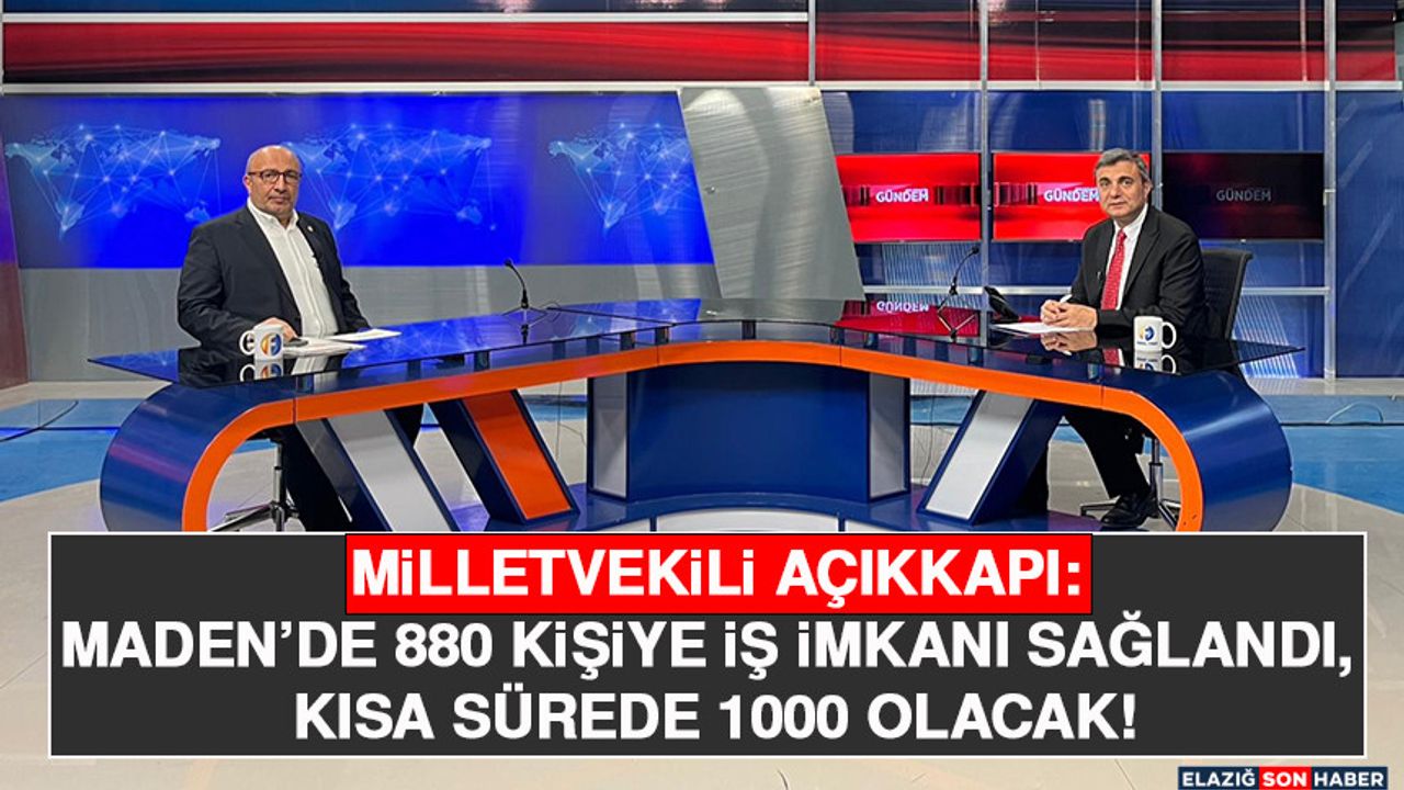 AK Parti Elazığ Milletvekili ve TBMM Plan ve Bütçe Komisyonu Üyesi Ejder Açıkkapı, Kanal Fırat–Kanal E ortak yayınında Genel Yayın Yönetmeni Zeki Akbıyık’ın hazırlayıp sunduğu “Gündem” programına konuk oldu. Programda önemli açıklamalarda bulunan Milletvekili Açıkkapı, Maden bakır sahasında şu anda 880 kişinin istihdam edildiğini, bu sayının kısa sürede 1000’e ulaşacağını ifade etti.