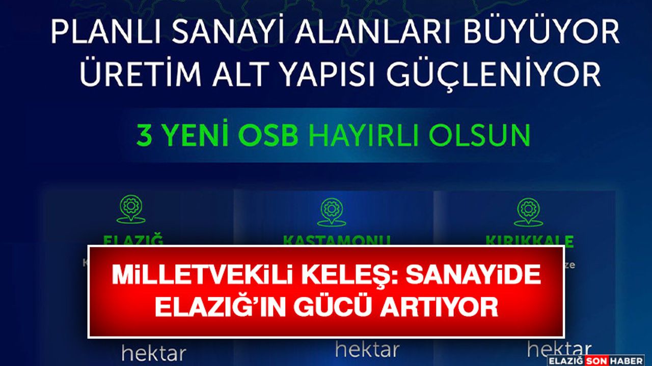 Milletvekili Keleş, 14 Ocak’ta Sanayi ve Teknoloji Bakanı Mehmet Fatih Kacır tarafından yapılan ve Türkiye genelinde 3 yeni OSB’nin ilan edildiğini duyuran paylaşımın da Kovancılar OSB’nin önemini ortaya koyduğunu ifade ederek, Elazığ’ın sanayi gücünün önümüzdeki dönemde daha da artacağını söyledi.