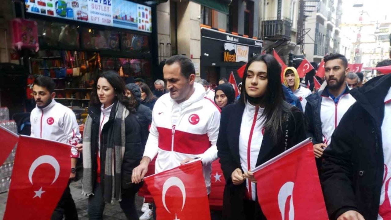 Beyoğlu’nda İstiklal Marşı’nın kabulünün 101’inci yıl dönümünde milli sporcular ile gençler hep birlikte İstiklal Marşı’nı okudu.
