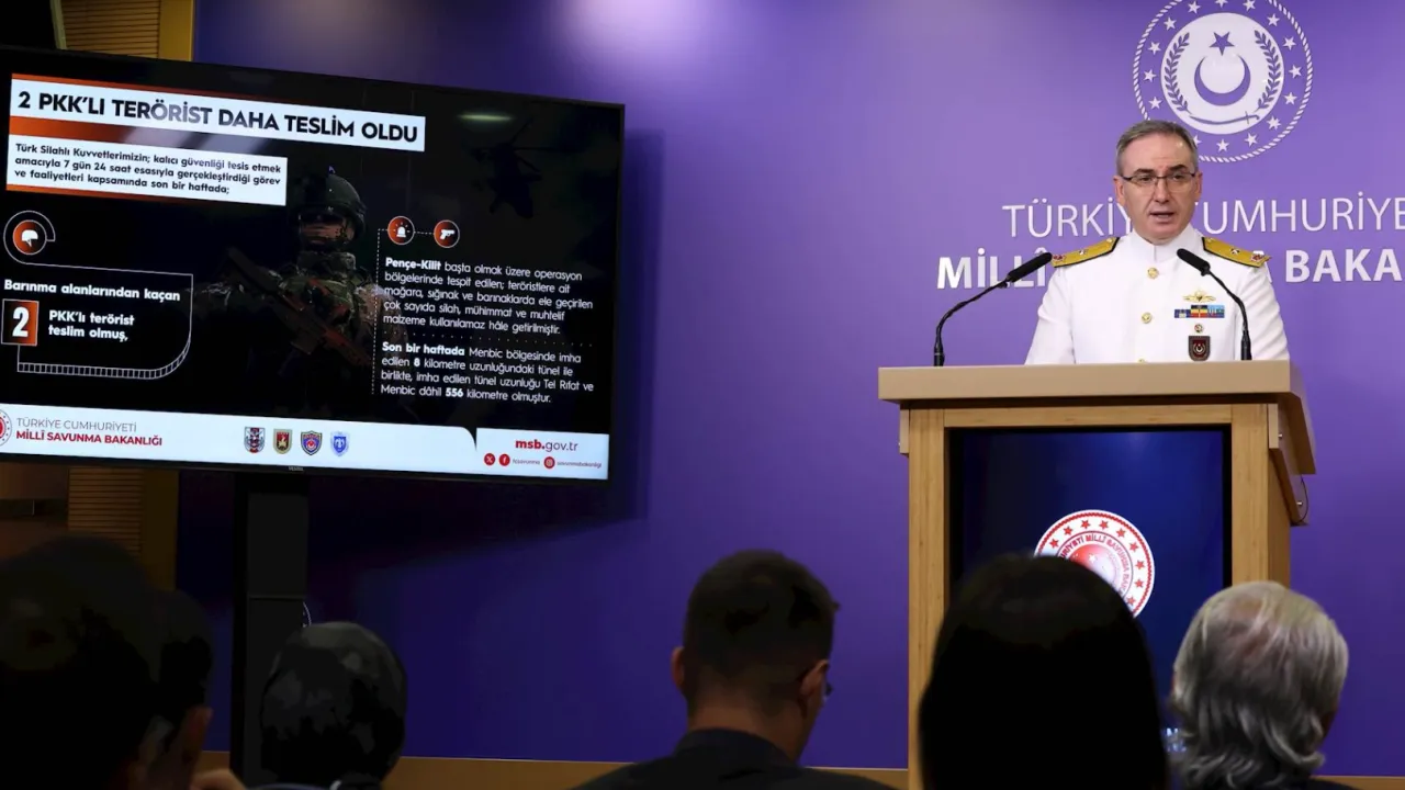 Milli Savunma Bakanlığı, haftalık basın toplantısında, son bir haftada 2 PKK’lı teröristin teslim olduğunu, hudutlarda 395 şahsın yakalandığını ve 166 kilogram uyuşturucu ele geçirildiğini duyurdu. Suriye’de imha edilen tünel uzunluğu ise 556 kilometreye ulaştı.ANKARA (İGFA) - Millî Savunma Bakanlığı (MSB), Haftalık Basın Bilgilendirme Toplantısı’nda, Türk Silahlı Kuvvetleri’nin (TSK) faaliyetlerine ve gündemdeki gelişmelere ilişkin önemli bilgiler paylaştı. Toplantıyı, MSB Basın ve Halkla İlişkiler Müşaviri ve Bakanlık Sözcüsü Tuğamiral Zeki Aktürk gerçekleştirdi.