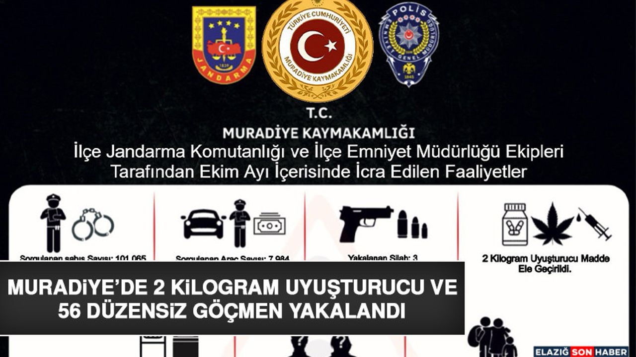 Muradiye Kaymakamlığından yapılan açıklamada, İlçe Jandarma Komutanlığı ve İlçe Emniyet Müdürlüğü ekiplerince ekim ayı içerisinde gerçekleştirilen çalışmalar sonucunda 101 bin 65 şahsın sorgusunun yapıldığı ve 5 kişinin yakalandığı belirtildi. Açıklamada, "Ekipler 7 bin 984 aracı kontrol etti, 214 araca cezai işlem uyguladı. Gerçekleştirilen operasyonlarda 3 adet ruhsatsız silah, 2 kilogram uyuşturucu madde ve 8 bin 898 paket gümrük kaçağı sigara ele geçirildi. Kayıp olarak aranan 3 şahıs bulunurken, 56 düzensiz göçmen ve 11 organizatör yakalandı. Kolluk kuvvetlerinin ilçe genelinde huzur ve güven ortamını sağlamak için yürüttüğü faaliyetlerin kararlılıkla devam edeceği belirtildi" denildi.