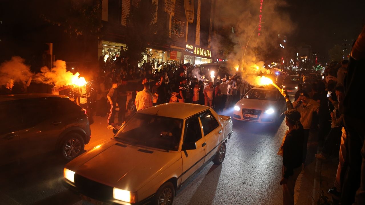 Araçlarıyla konvoy oluşturan taraftarlar, meşaleler yakarak kent merkezinde uzun süre kutlama yaptı.