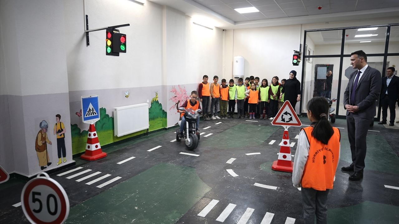 Trafik levhaları, kırmızı ışık, yaya geçidi ve diğer görsel materyallerle donatılan sınıfta, polis ve jandarma trafik ekipleri ile öğretmenler, öğrencilere trafik güvenliği konusunda eğitim veriyor.