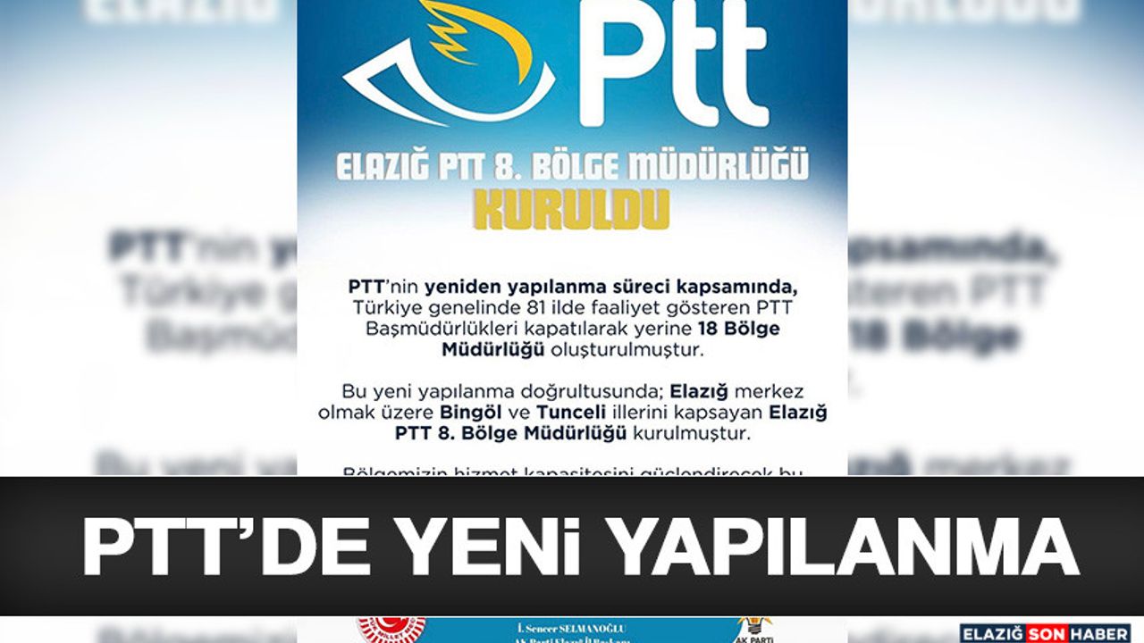 Ortak açıklamada, PTT’nin Türkiye genelinde yürüttüğü yeniden yapılanma çalışmaları doğrultusunda 81 ilde faaliyet gösteren PTT Başmüdürlüklerinin kapatıldığı, bunların yerine 18 Bölge Müdürlüğü oluşturulduğu ifade edildi. Bu kapsamda Elazığ merkez olmak üzere Bingöl ve Tunceli illerini kapsayan Elazığ PTT 8. Bölge Müdürlüğü’nün faaliyete geçtiği belirtildi.