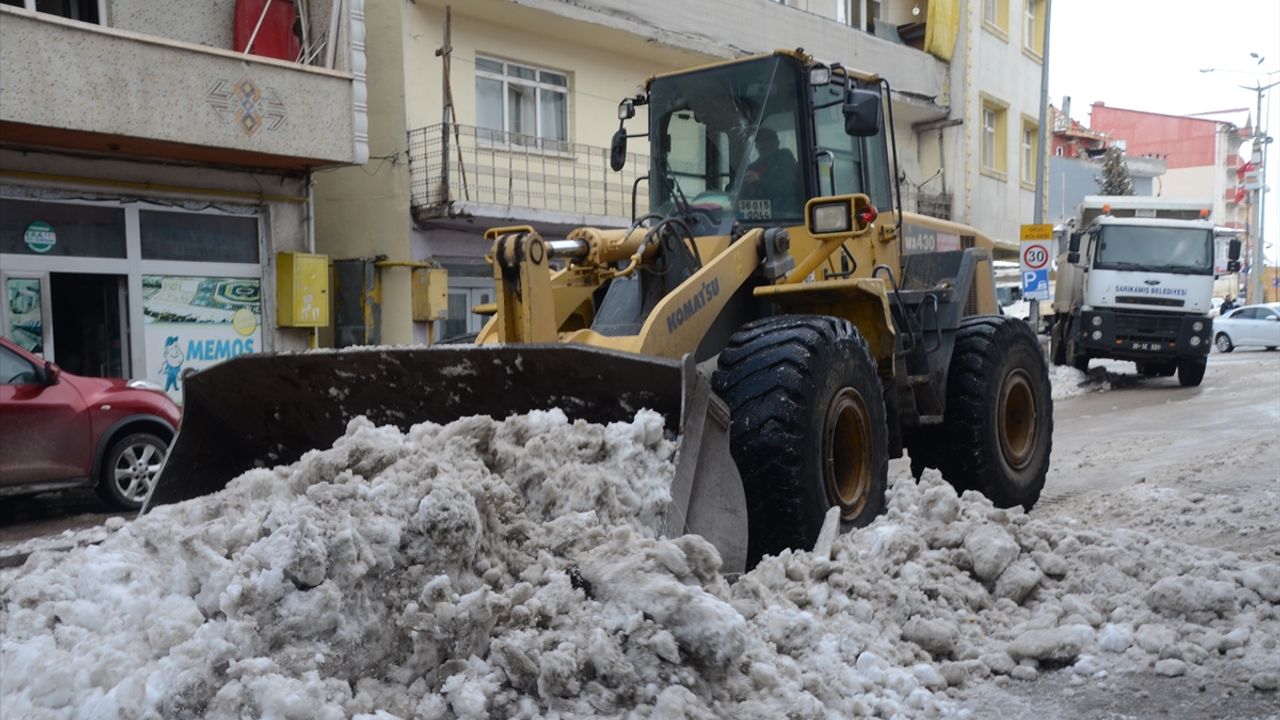 KARS (AA) - Kars'ın Sarıkamış ilçesinde, etkili olan yoğun yağışın ardından biriken kar, kamyonlarla yerleşim yerlerinin dışına taşınıyor.