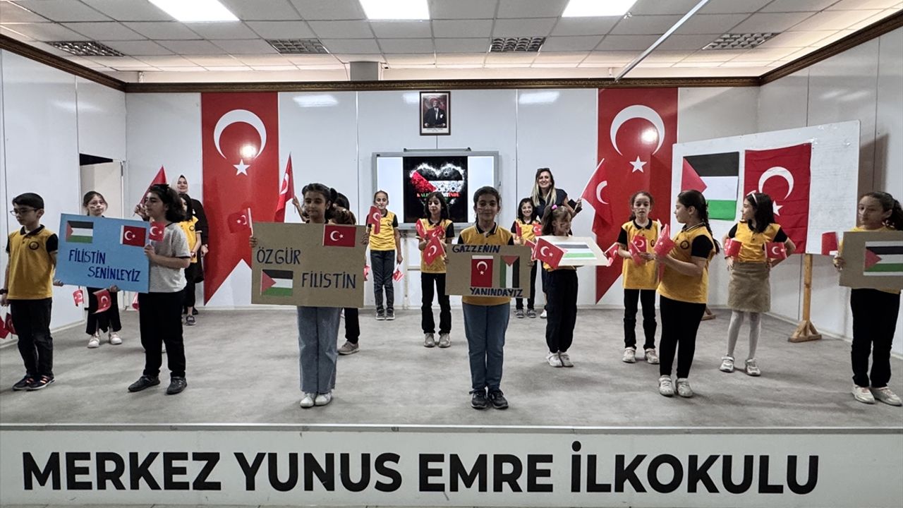 Milli Eğitim Bakanlığınca Türkiye'deki tüm okullarda bugün başlatılan 'Filistin Farkındalık Etkinlikleri' kapsamında Siirt'te Yunus Emre İlkokulu Konferans Salonunda düzenlenen programda, 'Kalbimiz Filistin'de' ve 'Özgür Filistin' dövizleri taşıyan öğrenciler, Filistin marşı okudu.