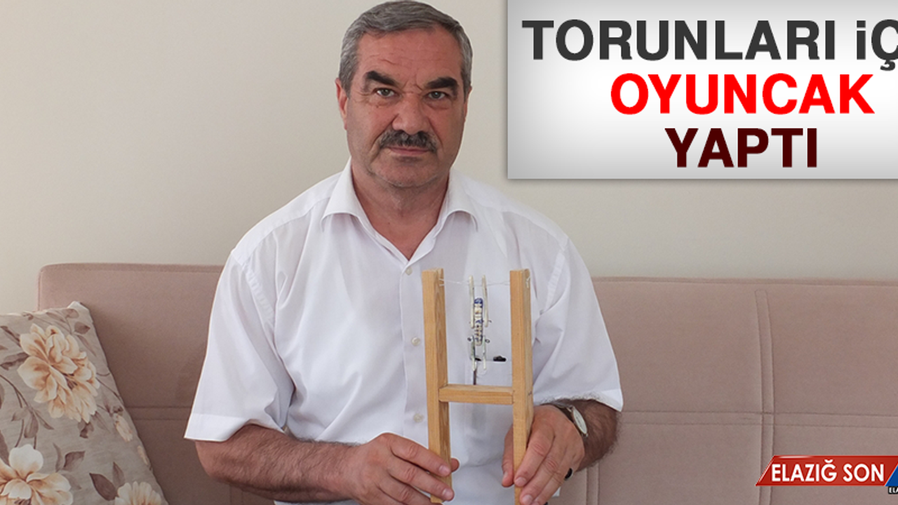 Keban Belediyesi'nden emekli olan Ahmet Demir evine ziyarete gelen torunlarını için tahta, çıta, ip ve bıçak kullanarak ipli cambaz oyuncağı yaptı.