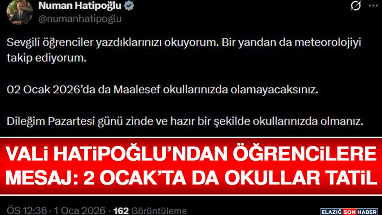 Vali Hatipoğlu, yaptığı açıklamada meteorolojik verilerin yakından takip edildiğini belirterek, öğrencilerin güvenliği için bu kararın alındığını ifade etti. Açıklamasında öğrencilere de seslenen Hatipoğlu, “Sevgili öğrenciler, yazdıklarınızı okuyorum. Bir yandan da meteorolojiyi takip ediyorum. 2 Ocak 2026’da da maalesef okullarınızda olamayacaksınız. Dileğim pazartesi günü zinde ve hazır bir şekilde okullarınızda olmanız” dedi.