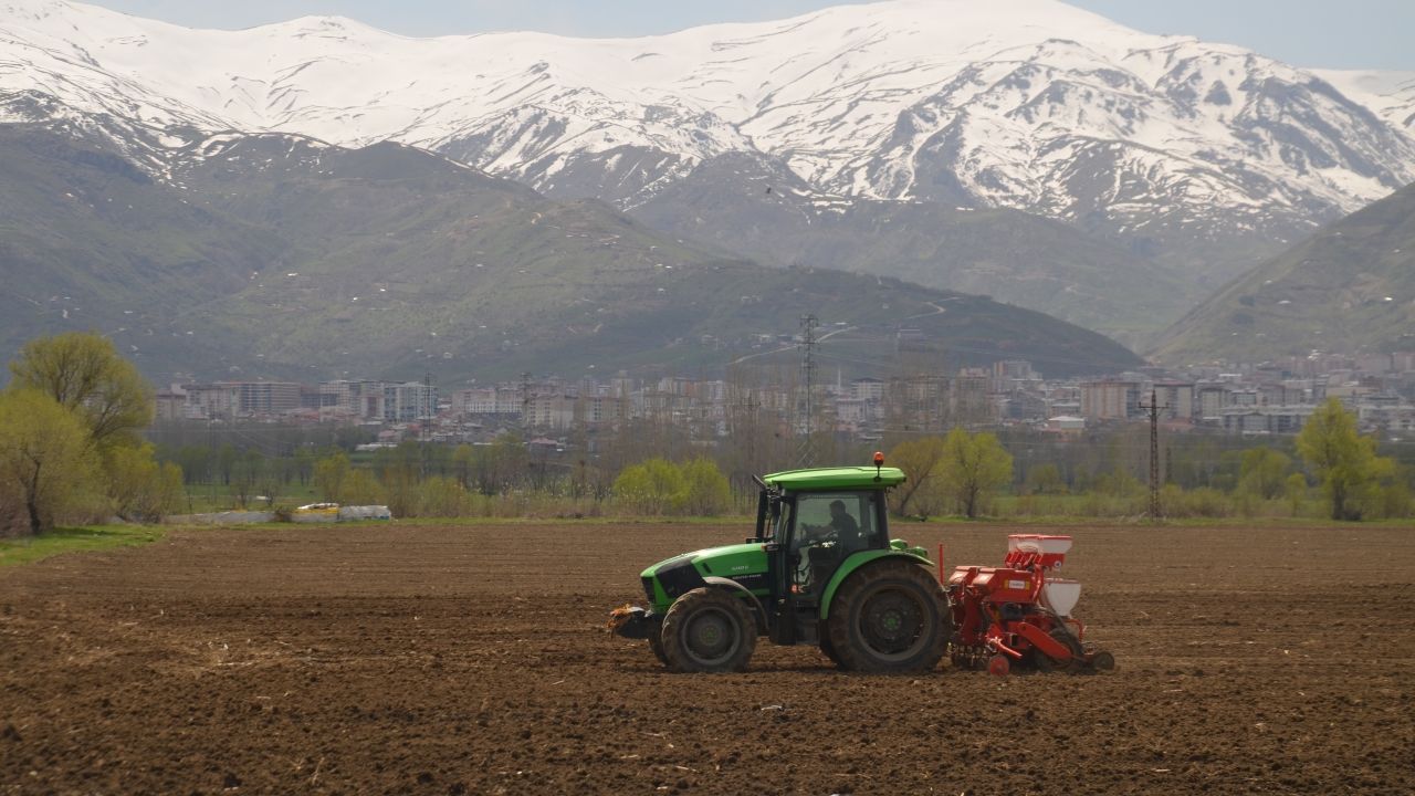 Tarlaları traktörlerle süren çiftçiler, şeker pancarı, arpa ve yonca ekimi yapıyor.