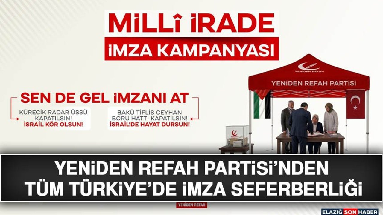 Yeniden Refah Partisi İl Başkanlığı tarafından başlatılan imza kampanyasıyla, Türkiye genelinde geniş kapsamlı bir saha çalışması hayata geçiriliyor. “Kürecik Radar Üssü kapatılsın, İsrail kör olsun, Bakü Tiflis Ceyhan Boru Hattı kapatılsın, İsrail’de hayat dursun” sloganlarıyla başlatılan kampanya kapsamında parti teşkilatları, il ve ilçe merkezlerinde kurulacak stantlarla vatandaşlardan imza toplayacak.